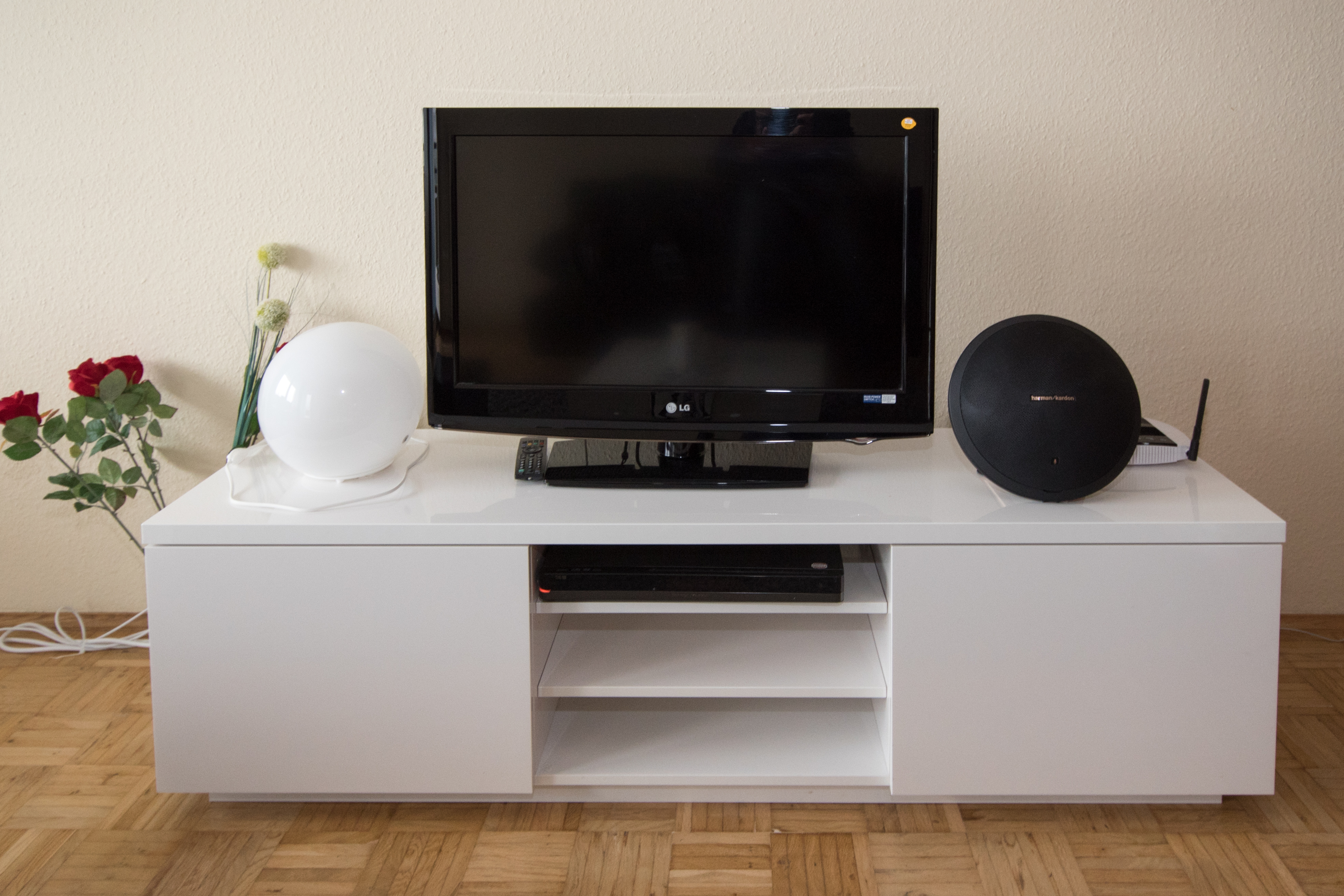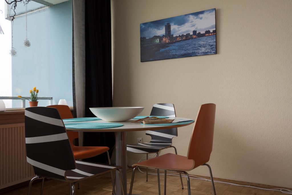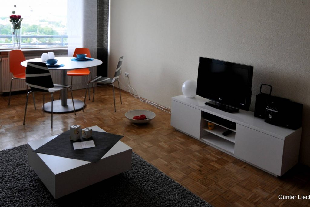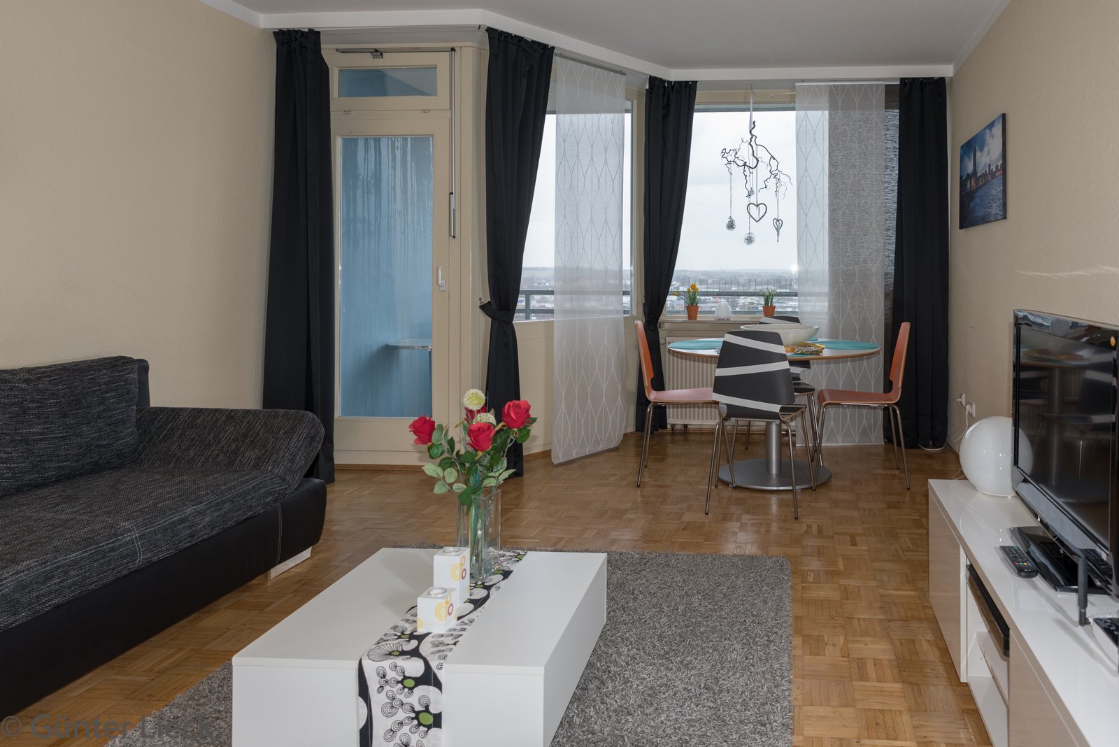 Im Wohnzimmer befindet sich ein gemütliche Couch, die zum Doppelbett ausgezogen werden kann. Gegenüber befindet sich die „Multimedia-Zentrale“ mit Fernseher, Internet (Glasfaser) sowie einem Harman Kardon System über das Sie von Ihrem Mobilgerät Musik abspielen können oder die Freisprechfunktion nutzen können. Am Fenster zum Balkon befindet sich der Eßtisch mit Fernblick von der 22. Etage. Der Balkon bietet sich an, um die ersten Sonnenstrahlen des Tages zu nutzen.